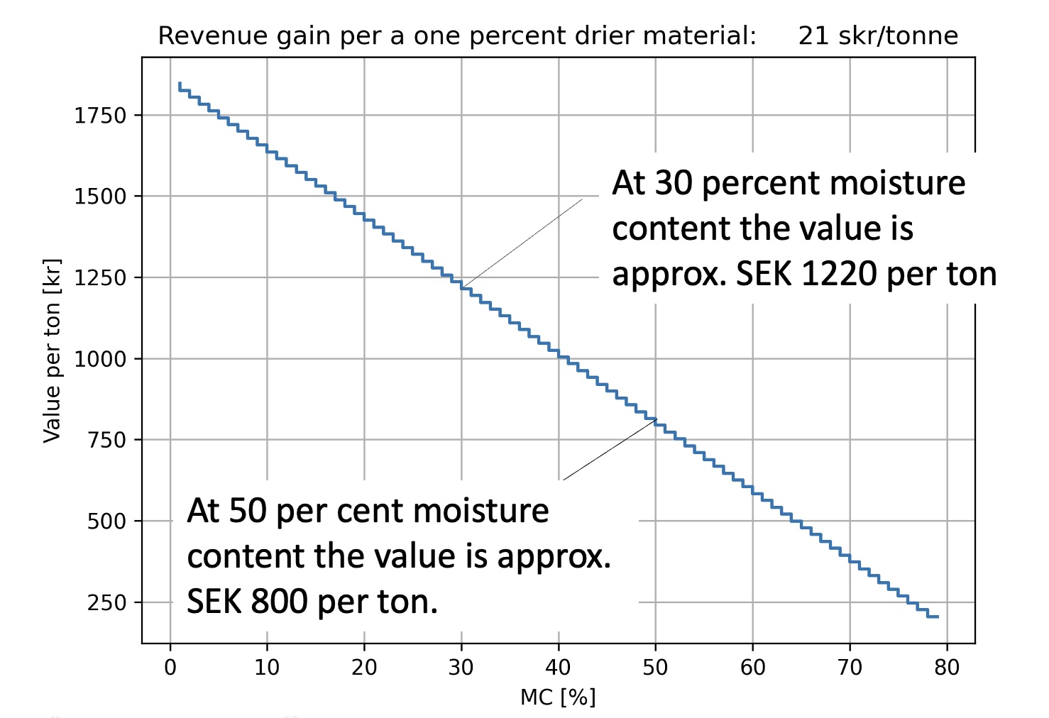 Thus, the pellet industry or other energy companies save drying costs. The diagram shows the energy content of biomass at different moisture contents, converted into value in SEK. The difference in value also corresponds to the costs of drying the biomass if the price is same as the raw material price. If the biomass is partly dried before delivery producers will reduce costs. Thus, measuring the moisture content when receiving biomass is a step forward in improving economy.
