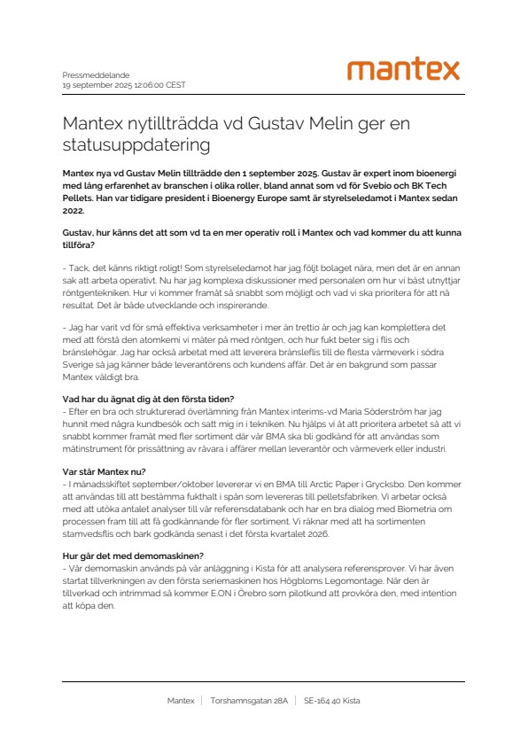 Mantex nya vd Gustav Melin tillträdde den 1 september 2025. Gustav är expert inom bioenergi med lång erfarenhet av branschen i olika roller, bland annat som vd för Svebio och BK Tech Pellets. Han var tidigare president i Bioenergy Europe samt är styrelseledamot i Mantex sedan 2022.